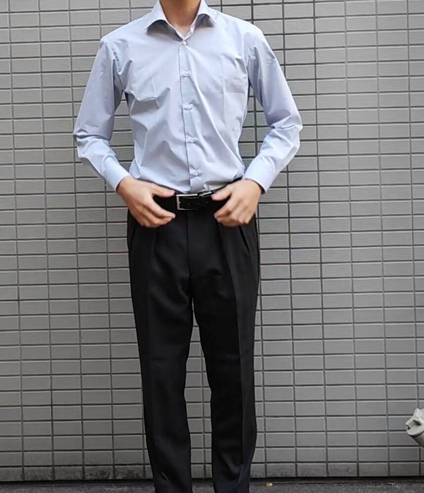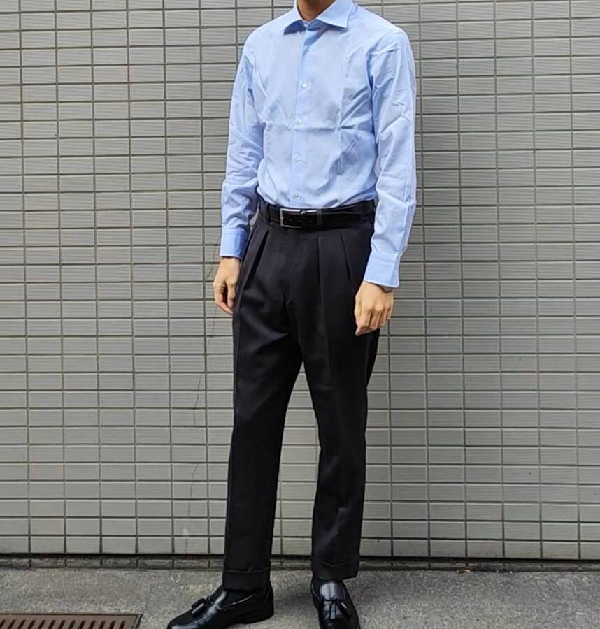 実際の着用写真はこちら。折り目が残っている写真で恐縮ですが、こちらもサイズはぴったりです。店舗で採寸してもらったのもあるかと思いますが、おそらくもともとの作りが細身になっていて、他店よりもシュッとした印象です。