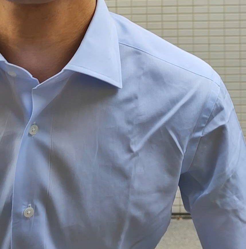 こちらは「SPEEDY DRY」という汗染みが目立たない生地で、ポリエステル100%ながら1万2000円しました。完全に機能性を重視した生地ですね。実際、汗染みは目立ちにくいので、夏場などに重宝しますが、ポリエステル生地に1万2000円はやはりけっこう高いなという感じはあるでしょうか。それでもこういう生地のシャツを一着もっていると何かと便利な印象です。