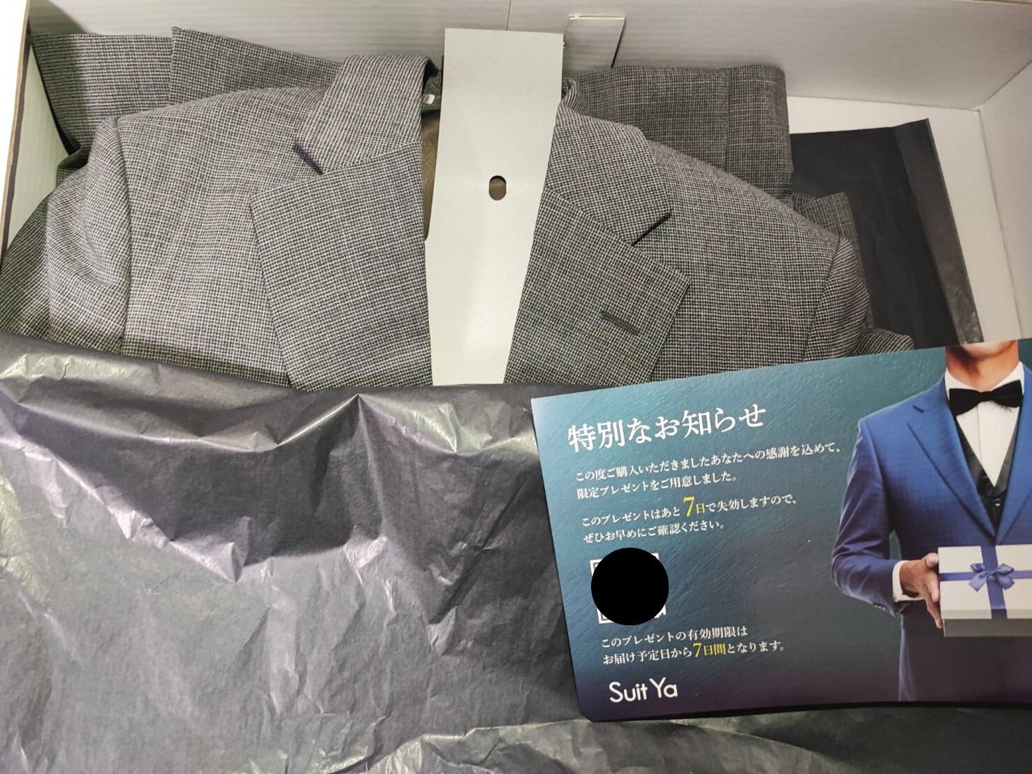 商品は箱に入って送られてくるのですが、このような形で畳まれたスーツがむき出しのまま入っている形になるので、ちょっと雑な印象は受けてしまいました。