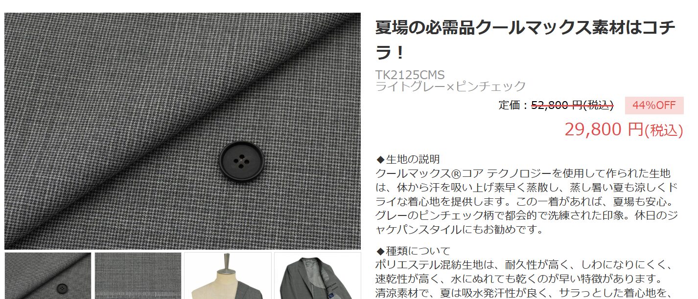 そして、宣伝されているような「税込み29,800円」という最安価格の生地は、ウール50%とポリエステル50%の混紡か、ポリエステル100%の生地の2択です。