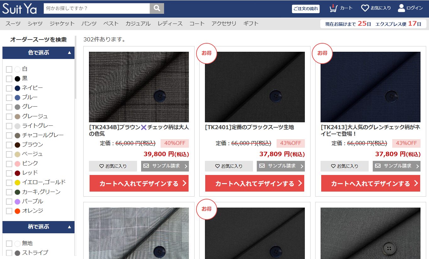 ちなみにSuit Ya、この最低価格帯の商品の大部分も含め、どれも「35%オフ」「44%オフ」などとお得感を演出しているところには、個人的に若干のいやらしさを感じてしまいます(笑)。実際、29,800円の最低価格帯の商品も、「44%オフ」などの表示込みでその価格になっている生地がほとんどのようです(26年2月時点)。まあ、どこのお店も似たり寄ったりのことをやってはいるんですけどね……。