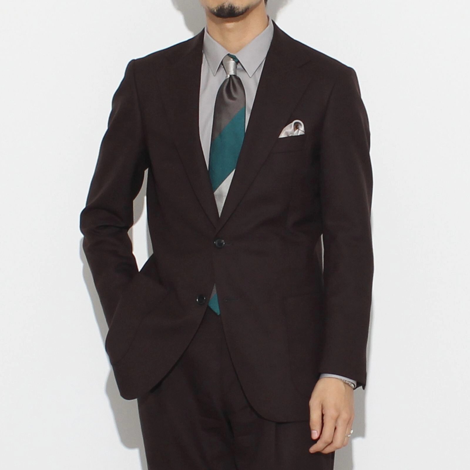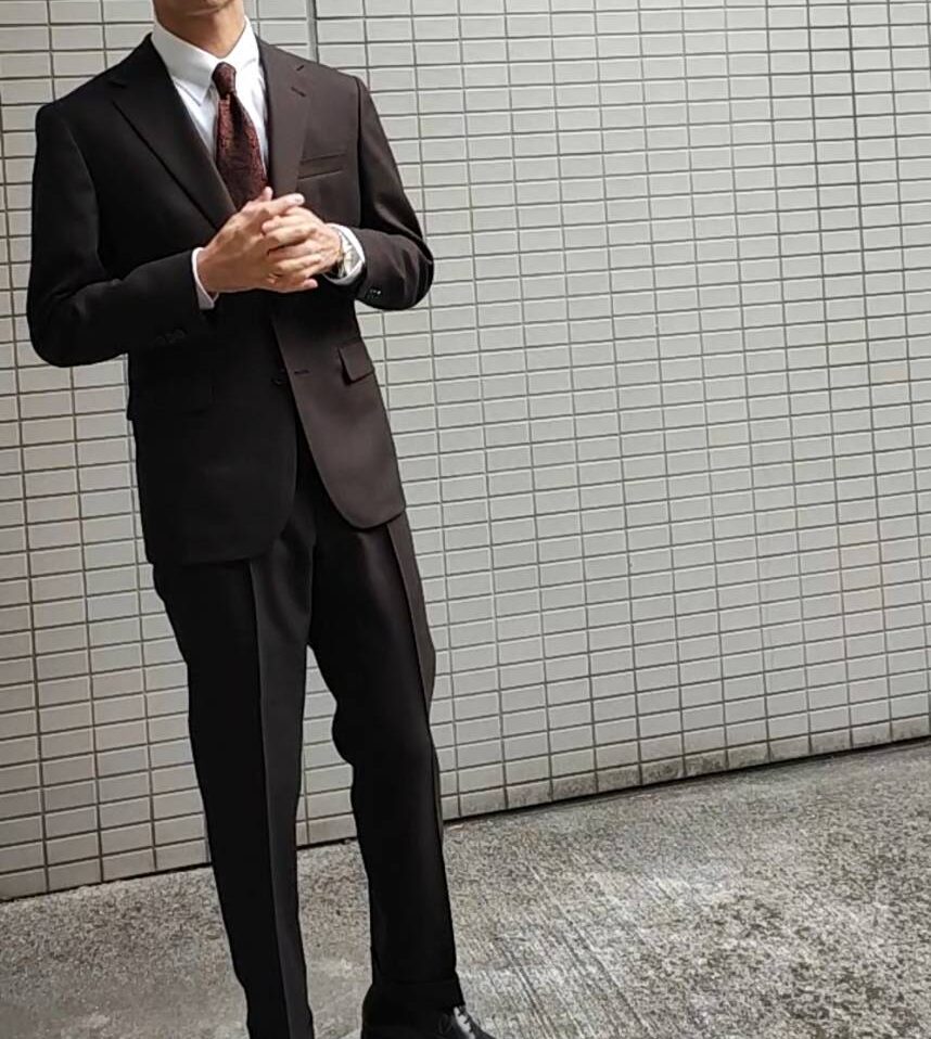では、実際に私が作ってみたスーツについてもお伝えします。先ほどからチラ見せしていますが、今回はウール100%の「AUTHENTIC TRAVEL」という生地(税込み6.9万円)のブラウンを選んでみました。少し暗めに見えますが、実物はやや暗めの上品なブラウンという感じです。